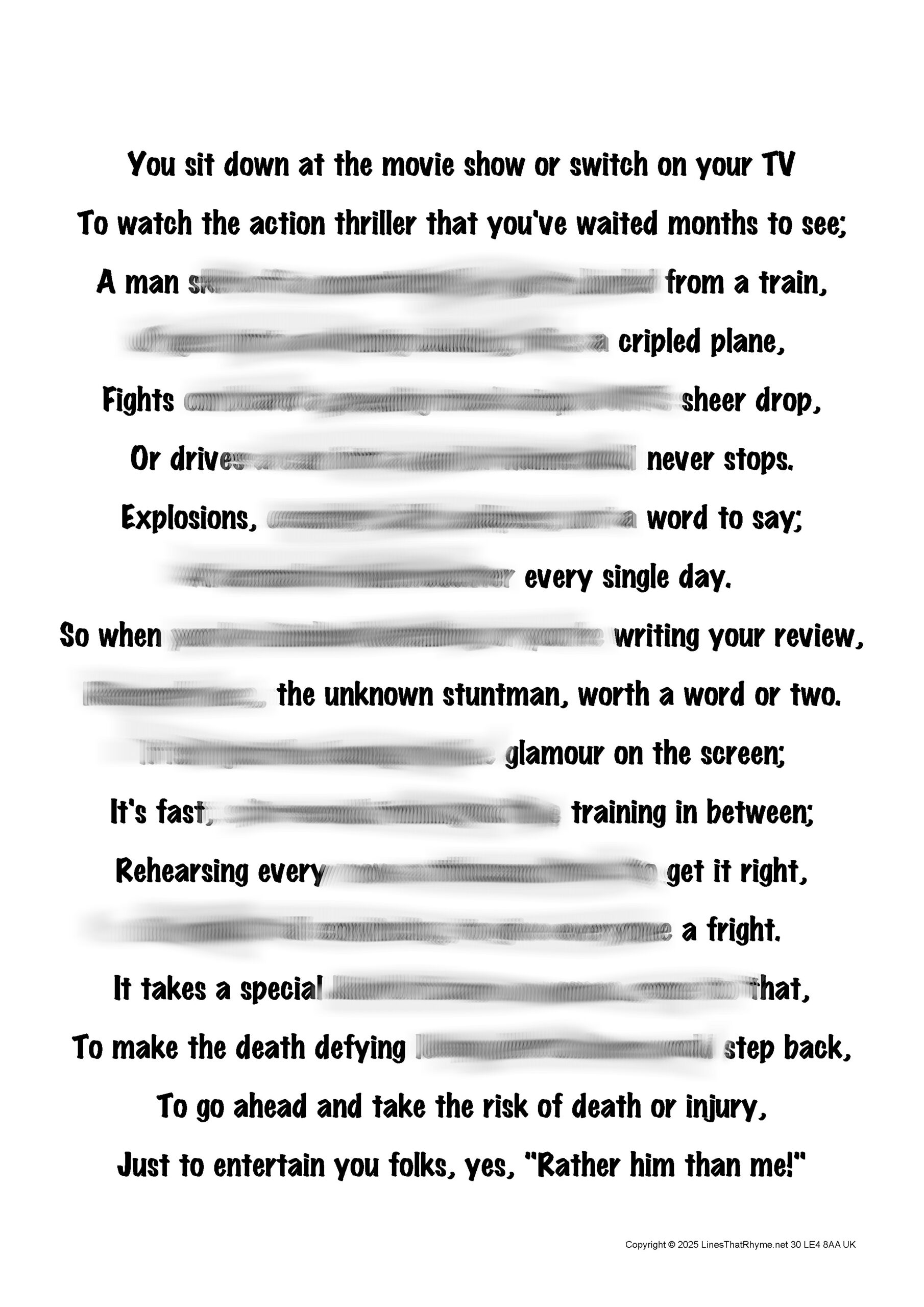 An 18-line rhyme for stuntmen in digital format. Only one sold per studio! Simple but effective. Use in your brochure, sales material, adverts, on your web site and Facebook and LinkedIn pages, on the office wall, and anywhere else you can think of. [Please note: The above image has been partially redacted in order to protect the intellectual property rights of the owner.]